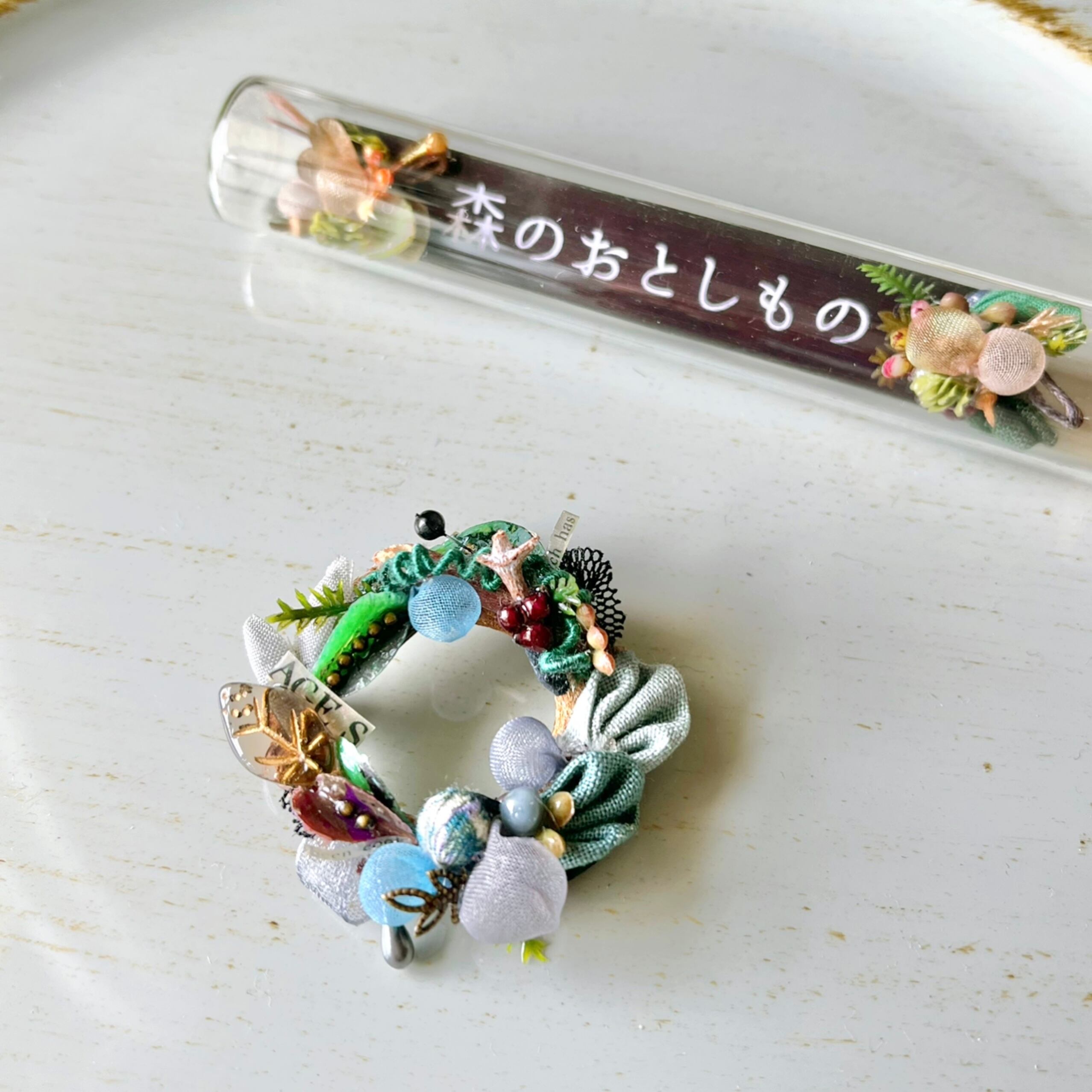 木の実や貝殻、お花など様々な素材を組み合わせた染めアクセサリーです。