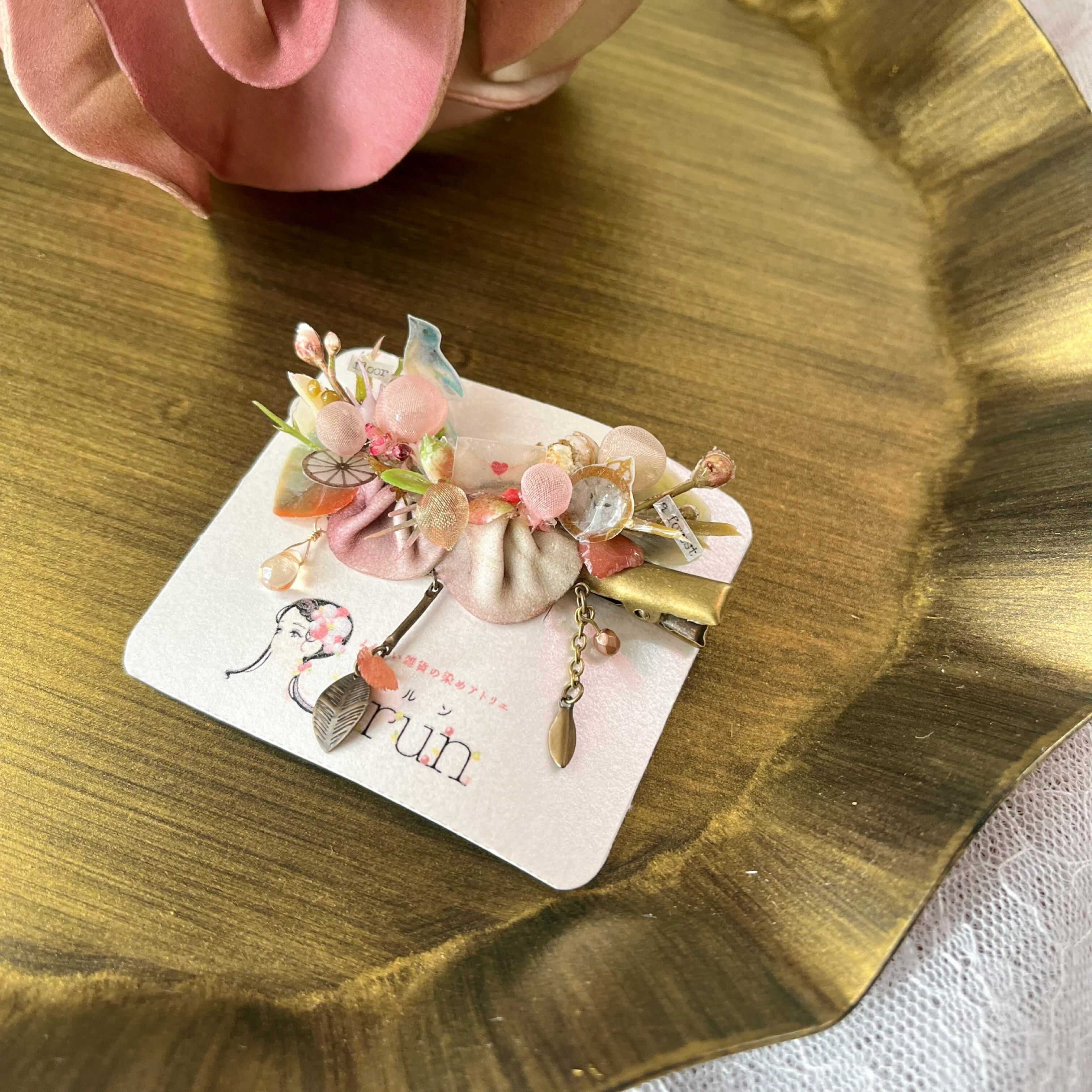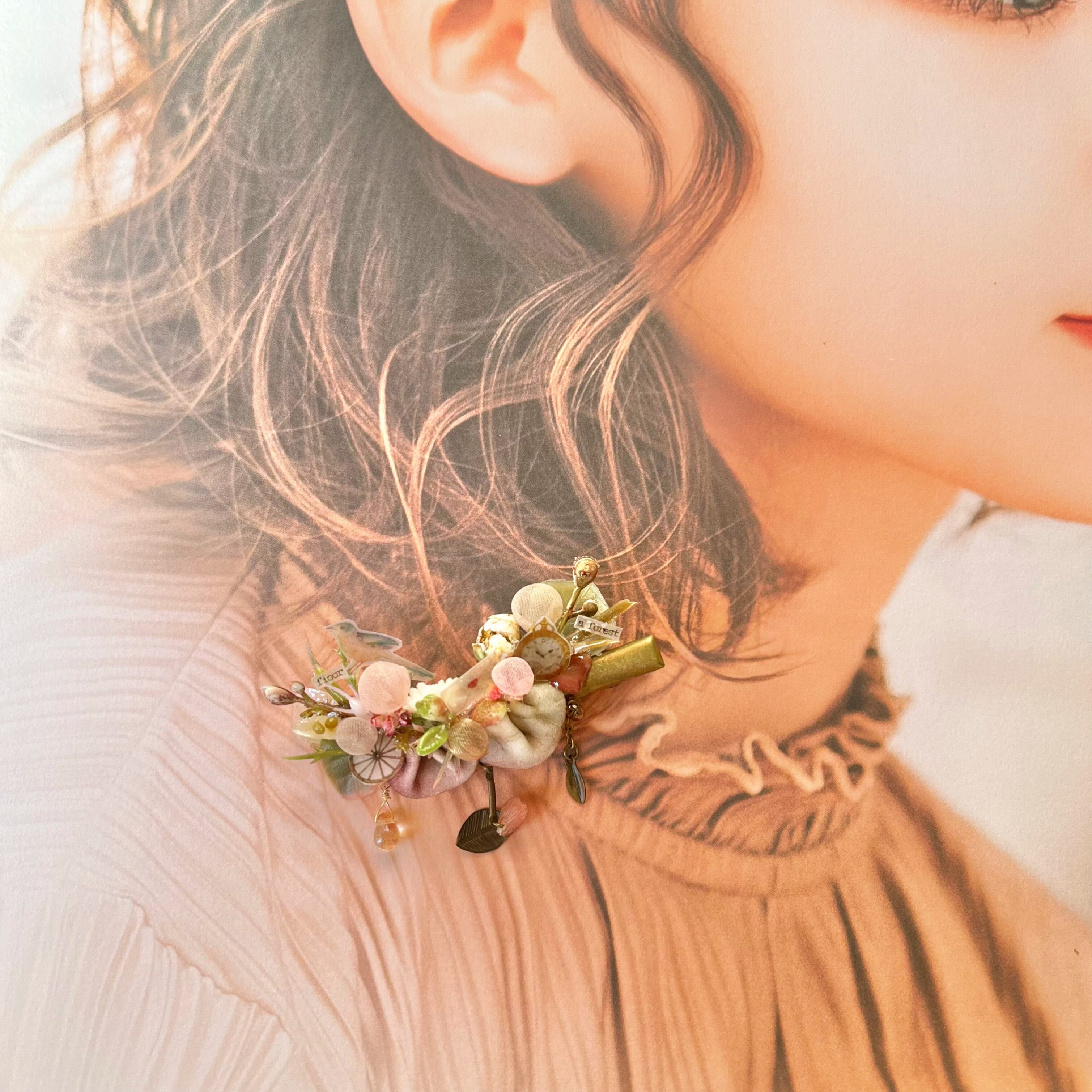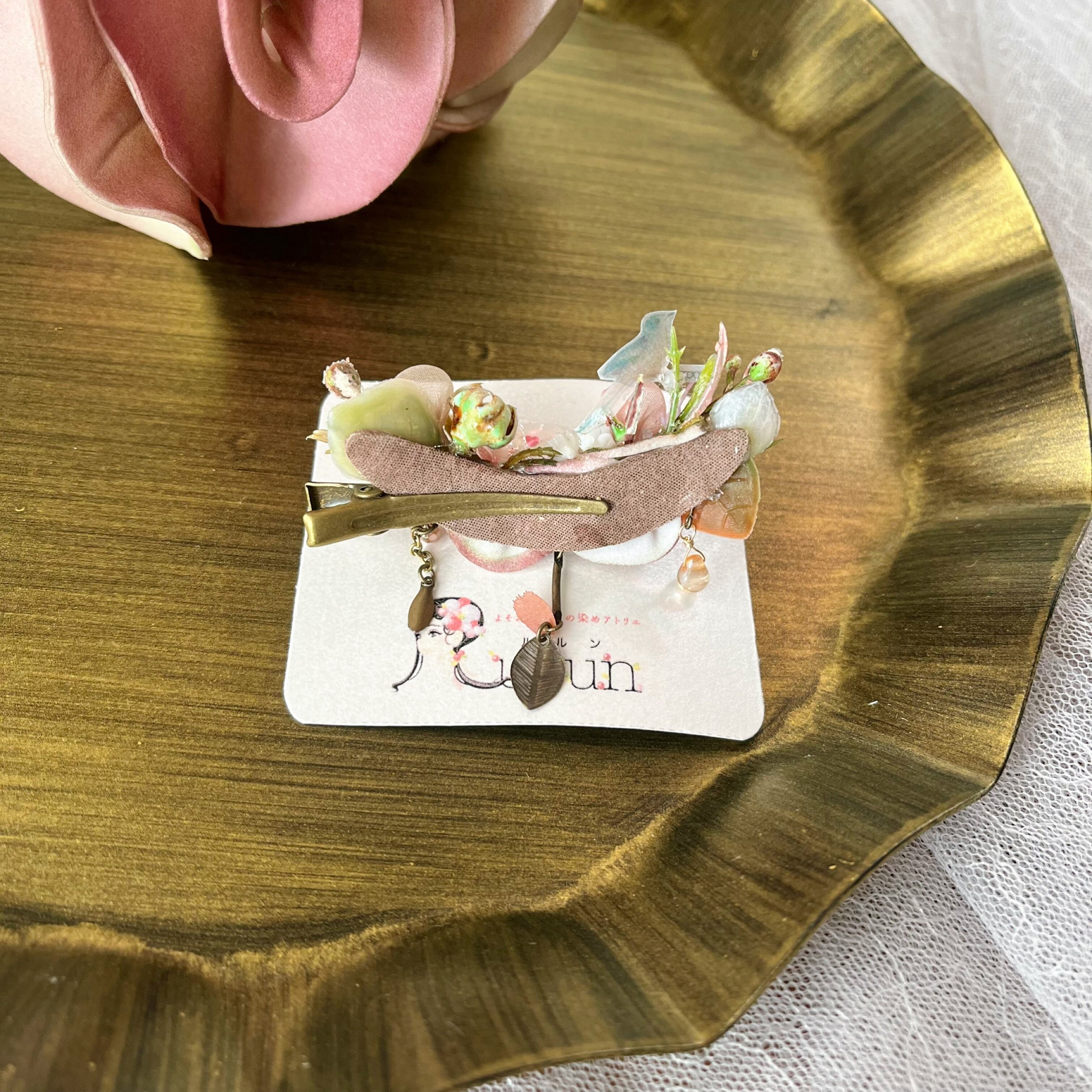 木の実や貝殻、お花など様々な素材を組み合わせた染めアクセサリーです。