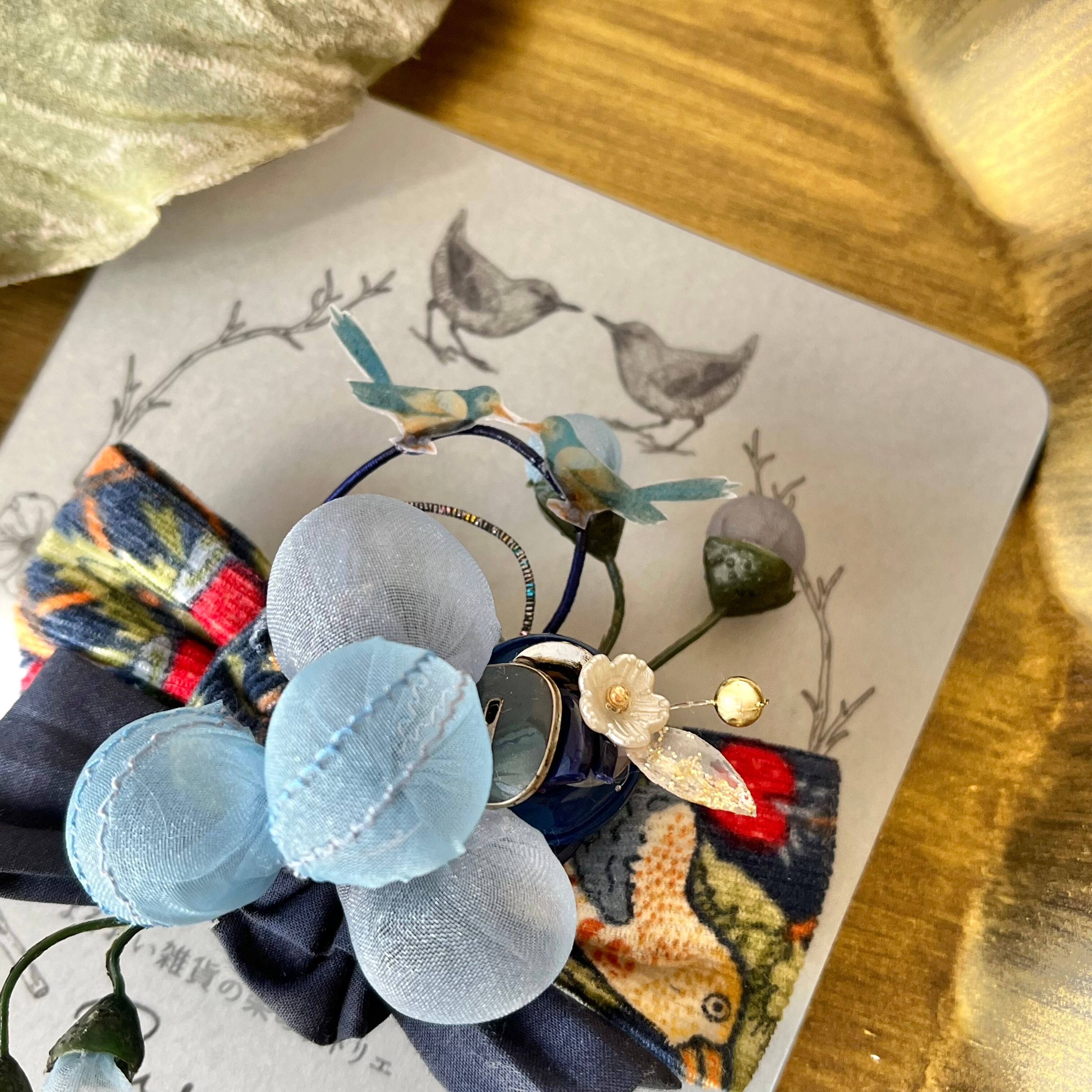アートフラワーやアンティークボタンを